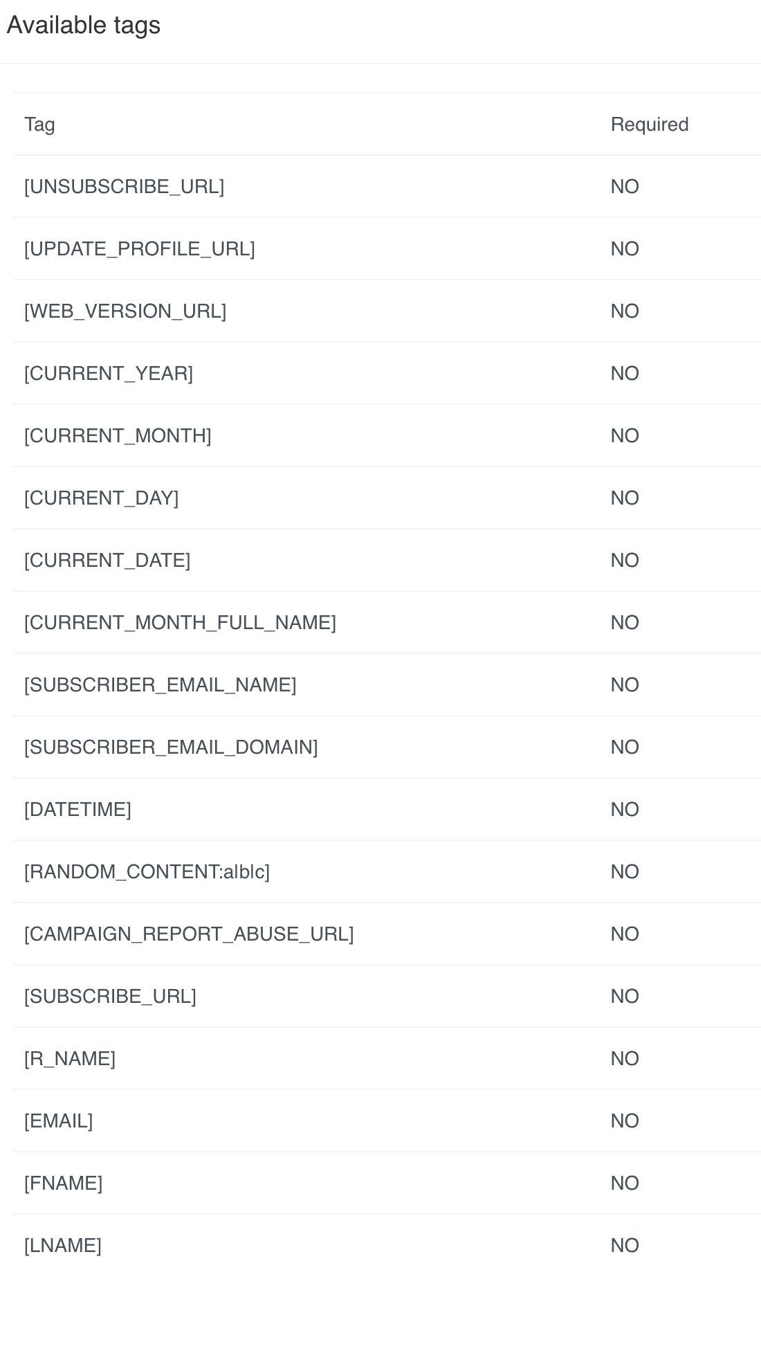 By using tags like `[FNAME]`, `[LNAME]`, `[R_NAME]`, and others strategically throughout your emails, you can create a customized experience that resonates with your audience. Whether you’re personalizing subject lines, greetings, or footers, each tag contributes to a more relatable and professional communication.&#x20;